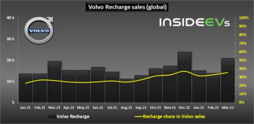 除了燃油车外,该公司的插电式混合动力汽车的销量也因为产能受限而受到影响。一季度,该公司售出了近50000辆插电式新车(49774辆),占到了总销量的三分之一以上。销量虽同比增长了7%,但是增速相比前几年明显放缓。其中,3月份插电式汽车销量超过20000辆(同比增长7%),占比达35.5%。
