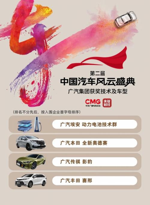 广汽埃安动力电池技术群获评委会特别奖,这也是首个电池科技大奖;广汽传祺旗下影豹荣膺“中央广播电视总台・2021中国汽车风云盛典”最佳设计车奖,整车设计奔放,风格张扬;广汽本田奥德赛实力收获中央广播电视总台・2021中国汽车风云盛典最重磅的三大车型奖项之一“最佳MPV”奖,该奖项也是此次评选MPV品类唯一的车型大奖。