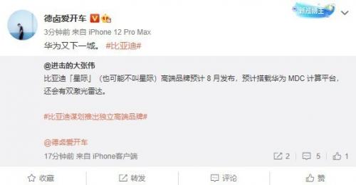 此前,有关比亚迪将推出定位更高的硬派SUV车型的消息在互联网上流传。近日有博主透露,比亚迪的全新高端品牌可能会命名为“星际”,预计会在8月份正式发布。根据其说法,比亚迪新车将搭载华为MDC计算平台,并且还会加入双激光雷达。