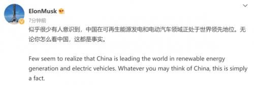 在国内社交平台微博上,马斯克发言:“似乎很少有人意识到,中国在可再生能源发电和电动汽车领域正处于世界领先地位。无论你怎么看中国,这都是事实。”