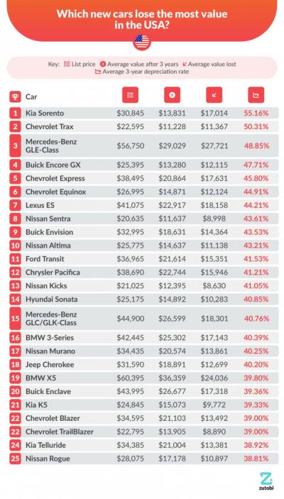 而在最不保值车型中,起亚索伦托(Kia Sorento)则位列第一,三年后二手车价下降了55.16%,从标价30845美元降至平均13831美元,而雪佛兰Trax50.31%的折旧率排名第二,从22595美元降至了11228美元。排名第三的梅赛德斯-奔驰GLE车价下降了48.85%,从56750美元降至29029美元。此外,别克昂科拉GX(47.71%),雪佛兰Express Van(45.80%),雪佛兰探界者(44.91%),雷克萨斯ES(44.21%),日产Sentra(43.61%),别克昂科威(43.53%)和日产天籁(43.21%)等贬值率都超过了40%,其中多款车型都隶属于通用旗下。