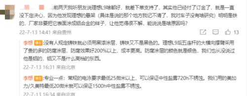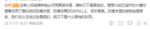 李想对于这个问题完全不怵,回复到:“没有人规定铸铁就必须用黑漆涂层,铸铁又不是黑色的。理想L9后五连杆的大横向摆臂采用了贵得多的防腐涂层,防腐效果好200%以上,成本更高。防腐涂层的颜色就是银色,我们也从没说过它是铝的,铝又不是什么高档的东西。”