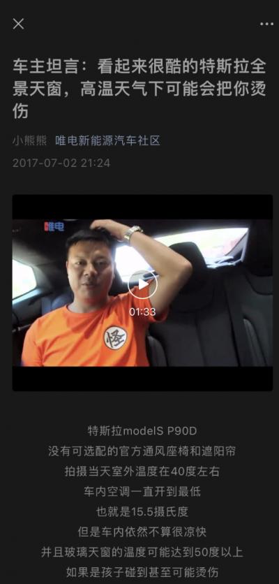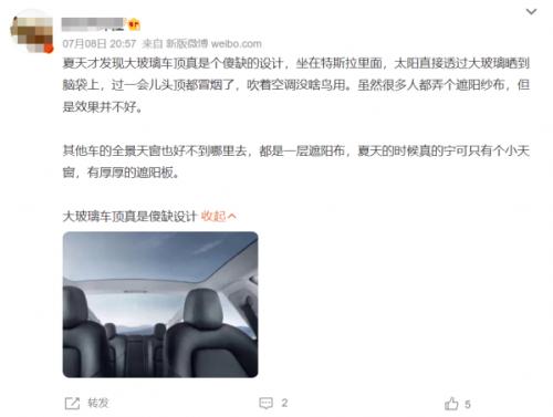 作为在国内卖得最好的新能源车企之一,采用全景天窗设计的特斯拉也在网上遭到了最多车主的吐槽。有特斯拉车主发微博表示:“自从开了特斯拉后,就被晒得惨不忍睹,身上最白的地方就是手腕了。”也有打车打到特斯拉的乘客表示,由于车辆的全景天窗没有遮阳帘,乘坐特斯拉的这半个小时无比痛苦。