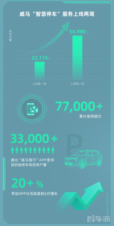 据介绍,威马智慧停车服务上线第一周总访问量为22115次,第二周总访问量为54980次,上线两周达77000+的使用频次;超33000的用户通过威马智行APP查询目的地停车场,带动APP日活跃度较6月增长超20%。同时,上线两周,用户已搜索使用51座城市的5552个停车场,上海、北京、温州三城合计贡献的使用频次占比超10%。智慧停车服务第一阶段现已覆盖全国100余座城市的70000+个停车场库。威马汽车官方还表示,随着功能迭代,最终他们将为用户提供“找车位到预约停车再到无感支付”泊车场景全流程智能体验。