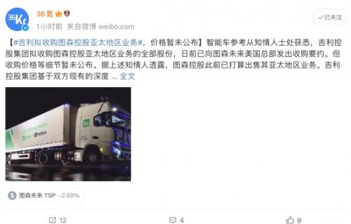 据了解,吉利控股集团拟收购图森控股亚太地区业务的全部股份,日前已向图森未来美国总部发出收购要约,但收购价格等细节暂未公布。据有关知情人透露,图森控股此前已打算出售其亚太地区业务。吉利控股集团基于双方现有的深度合作以及巨大的协同潜力,代表买方提交此不具约束力的要约函,以从图森控股收购其亚太地区业务,包括但不限于运营或支持此类业务的相关子公司业务及其亚太地区业务所需的相关资产。对此,有市场分析认为,吉利控股集团若收购成功,对图森未来的股价有所帮助。不过,也有网友表示不太能理解。