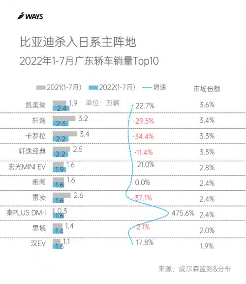 近日,据智车派了解,威尔森公布了1月-7月广东省的轿车市场分析。据悉,威尔森监测显示,比亚迪秦PLUS DM-i今年1-7月份广东地区销量达到1.6万辆,比亚迪汉EV同期销量1.3万辆,两款车型携手杀入广东地区轿车销量Top10榜单,而在去年同期该榜单还是日系车的天下。