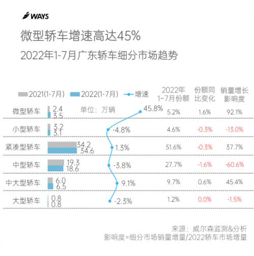 其中,五菱宏光MINI EV成为广东省轿车销量Top10里唯一一款非日系、非比亚迪的车型,它成为了广东人心水微型轿车的代表。而在2022年1-7月份广东省轿车细分市场中,微型轿车增速领跑,同比增幅高达45%,其余细分市场波动较小。