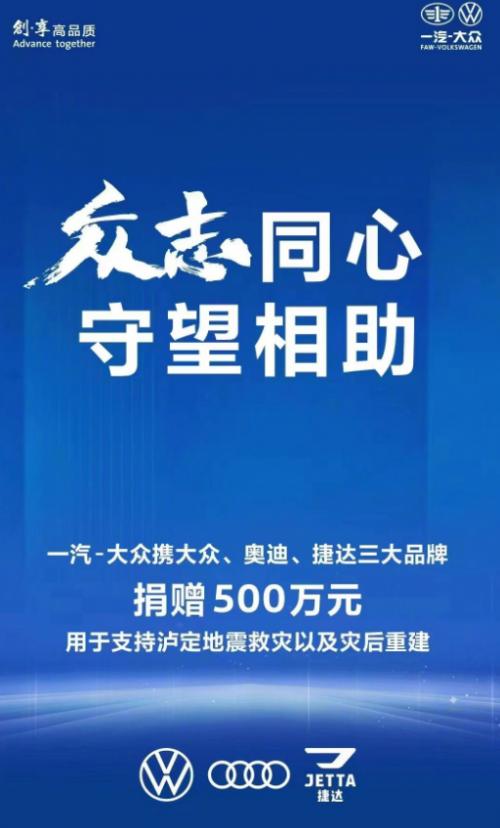 一汽-大众携大众、奥迪、捷达三大品牌捐赠500万元用于支持泸定地震救灾以及灾后重建。同时,中国一汽携红旗品牌、解放品牌、一汽-大众、一汽丰田捐赠2000万元。此前,比亚迪发布公告称,由比亚迪慈善基金会向四川省慈善联合总会捐赠500万元。宁德时代向甘孜州捐款500万元,助力当地开展受灾人员救助以及灾后的恢复重建工作。