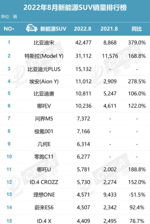 紧随其后的是特斯拉Model Y,8月销量为31112辆,同比增长168.8%。与此同时,比亚迪元PLUS、广汽埃安Aion Y以及比亚迪唐也跻身前五,8月销量分别为15132辆、11012辆以及10811辆。