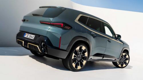 从外观上看,宝马XM保留了其概念车上的大部分设计理念。其前脸硕大的双肾式进气格栅十分显眼,并且在边框处还加入了金色线条进行点缀。新车大灯同样采用了此前已在新款7系和X7上出现的分体式大灯,上方为LED日间行车灯,下方的远近光灯组与前包围相融合,有着不错的一体性。从侧面看,新车采用了溜背式的车身设计,有着不错的运动感。新车的前后轮翼子板加入了宽体处理,配合上275/35 R23规格前轮和315/30 R23规格后轮,看上去非常霸气。车尾的高位刹车灯和双边四出排气管也点明了该车的运动性能。