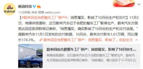 近日,有媒体报道称,蔚来汽车位于合肥的整车工厂暂停生产。11月2日,蔚来汽车方面就此回应称,“消息属实,确实影响了10月份的生产和交付进度。”