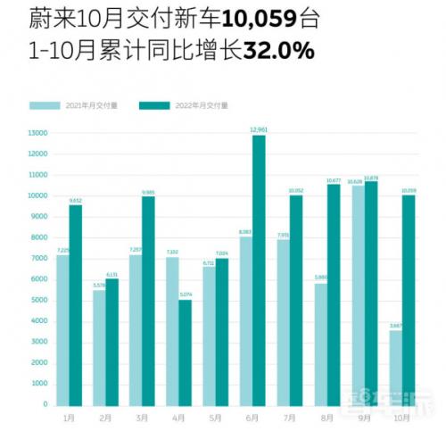 2022年1-10月,蔚来交付新车92493台,同比增长32%。截至2022年10月31日,蔚来汽车累计交付量达到25.96万辆。