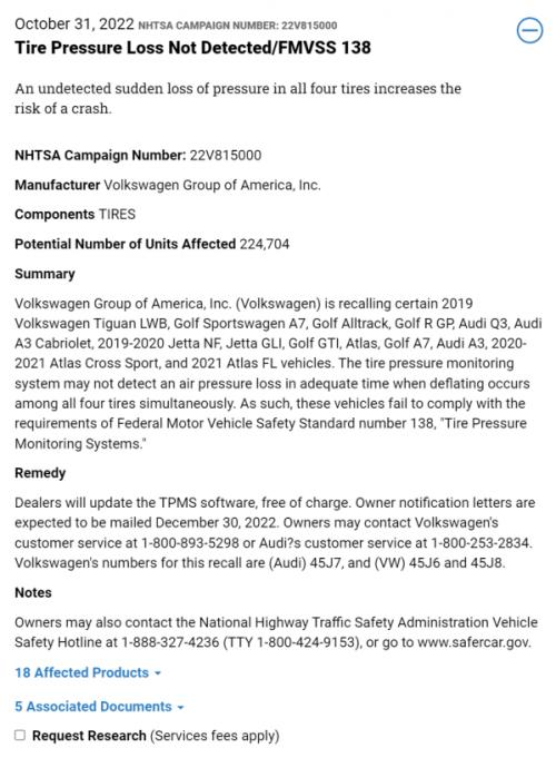 大众在相关说明中没有提到与问题相关的可能出现轮胎损坏或爆胎的情况,而是强调传感器如何检测这种情况。但是大众在给NHTSA的一封信中表示,这个问题不会构成不合理的安全风险,因为轮胎遭到穿刺或者存在缓慢漏气的情况,传感器都会有检测到。大众在召回公告中进一步解释道:“当所有四个轮胎同时发生放气时,车辆的的胎压监测系统(TPMS)可能无法在足够的时间内检测出车辆胎压变化。”不过对于一般车主而言,四个轮胎同时出现漏气这一情况发生的可能性很小,不过根据法规,这些车辆还是需要进行召回。