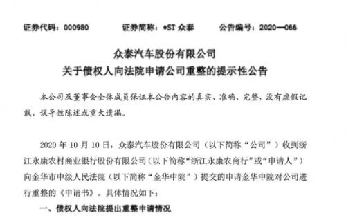 众泰发布《关于公司重整进展的公告》
