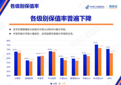 12月5日,中国汽车流通协会和精真估联合发布《2022年11月中国汽车保值率研究报告》。总的来看,11月份各级别车型的保值率有所下降,SUV车型下降得尤为明显,其中中大型SUV和MPV单车价格较高,是贬值较快的产品。