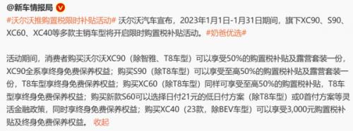 随着2023年的到来,此前2022年的汽车购置税减半优惠也暂时落下帷幕。不过虽然官方优惠不再提供,但各家车企为了吸引用户购车,依旧还是推出了各自的优惠政策。近日,沃尔沃官方宣布,将在2023年1月1日到1月31日期间,针对旗下XC90、S90、XC60、XC40等多款热门车型开启限时购置税补贴活动,并还将提供多项购车福利政策,以吸引消费者选购。