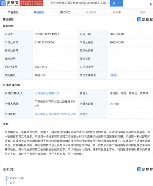 对于此现象,比亚迪做出了相关专利研究,以此来提升肥胖者的用车体验。近日,据智车派了解,国家知识产权局网站显示,比亚迪股份有限公司申请的“一种可收拢转向盘及具有该可收拢转向盘的车辆”专利公布。