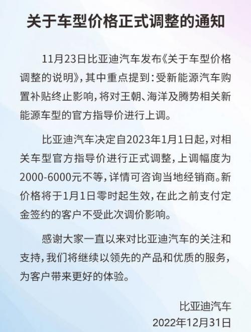 此外,还有一点需要注意的地方。根据官方的公告,由于受到了新能源汽车购置补贴终止的影响,比亚迪已经于2023年1月1日凌晨0点正式对王朝/海洋/腾势相关的新能源车型的官方指导价格进行上调,上调幅度为2000元到6000元不等。虽然在正式上调售价之前支付定金签约的客户不会受到此次价格上调的影响,但是这毫无疑问也会在一定程度上影响到部分消费者购买比亚迪新车的热情,因为同样是补贴终止,其实有部分厂商并没有上调旗下车型的价格,而是自己把其中的差价给补了。