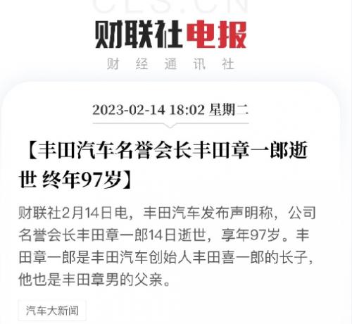 当前,丰田汽车仍然是全球出货量最大汽车厂商,在行业中处于相当领先的地位。根据相关数据,在2022年,丰田汽车是唯一一家汽车销量突破1000万的厂商。不过,2月14日,智车派注意到,丰田汽车官方发布声明表示,该公司的名誉会长丰田章一郎于本月14日逝世,享年97岁。