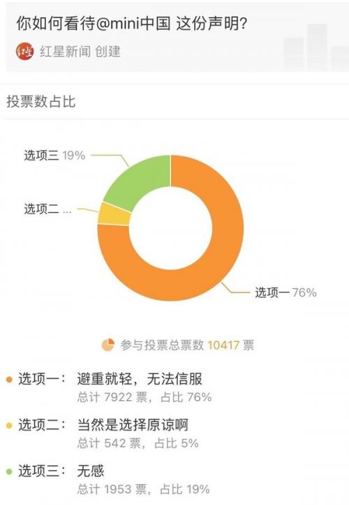在宝马MINI发布道歉声明之后,有相关媒体就此事进行了投票,目前已经有超过一万名网友参与。其中,选择接受宝马MINI道歉的网友仅为5%左右,有超过四分之三的网友认为宝马MINI的道歉是“避重就轻,无法信服”。此外,还有大约20%的网友对此次事件“无感”。