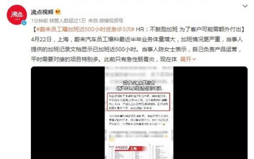 4月22日,上海蔚来汽车员工爆料最近半年业务体量增大,加班情况更严重,当事人提供的加班记录文档显示其已加班近500小时。当事人陈女士表示,自己负责产品运营,平时需要对接的项目特别多。此前只有急性肠胃炎,现在体检还发现21处异常。加班期间多次发烧,只有自己上吐下泻才去挂急诊,这样的急诊都发生了3次。