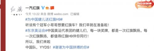8月5日,智车派了解到,一汽红旗官微发文宣称:听说有个冠军小哥哥想要红旗车?我们其实早就在准备了!中国奥运代表团的健儿们辛苦了,你们在运动场上拼尽全力只为让“红旗飘扬”在领奖台!中国队,永远的神!