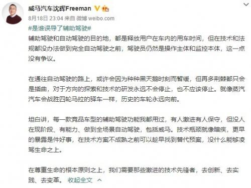 近日,威马汽车创始人沈晖在微博上再次发表了自己对于自动驾驶和辅助驾驶的看法。沈晖表示,辅助驾驶和自动驾驶的目的地,都是释放用户在车内的用车时间,但在技术和法规都没办法做到完全自动驾驶之前,驾驶员仍然是操作主体和监控本体。