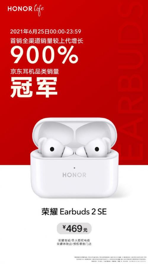 6月25日上午10:08,随荣耀50系列一同亮相的耳机产品荣耀Earbuds2 SE正式迎来首销,原售价469元,首销限时优惠30元,抢购价仅需439元。作为一款支持主动降噪的耳机产品,荣耀Earbuds2 SE受到了诸多消费者的喜爱,截至6月25日23 : 59分,这款产品取得了全渠道销量较上代增长900%的成绩,并且荣获京东平台耳机品类25日销量冠军。